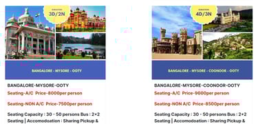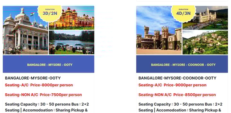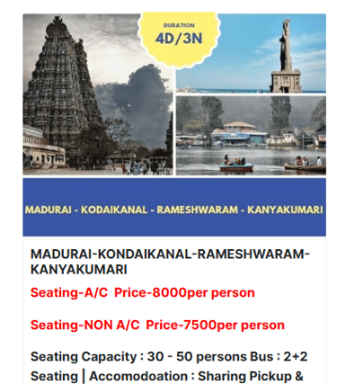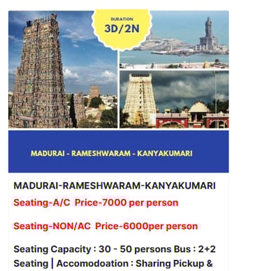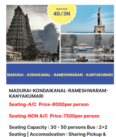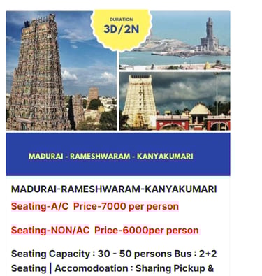At Sri Lakshmi Srinivasa Travels, we offer ready-made bus tours of Southern India and guarantee our clients the best travel experiences. By being dedicated to excellence, we pursue perfection and strive to exceed our client's expectations by providing them with unprecedented service quality. We have tour packages planned meticulously, as well as daily and weekly tours carefully designed from Tirupati to destinations like Madurai, Kodaikanal, Ooty, Rameswaram, Kanyakumari, Bangalore, Mysore, and more. A blend of customization and customer satisfaction will be our goal. We intend to leave distinct impressions on the tourism memories of those who seek the diversity of South India's landscapes and its cultural wealth. Count on our Sri Lakshmi Srinivasa for more than an ordinary trip...