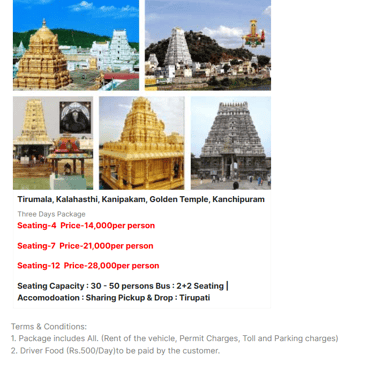 If you are going for a religious tour, sightseeing, or airport transfer, then Sai Travels Tirupati will accompany you at all times, ensuring you reach your destination comfortably and on time. Enjoy the Sai Travels Tirupati tours which will be the best combination of convenience and reliability for your next trip; let us take your travel dreams and turn them into unforgettable memories. Book with us now and set sail into unchartered waters!